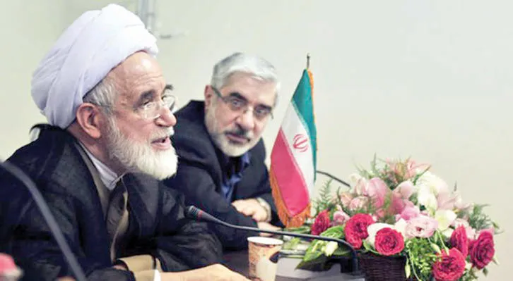 قائدا «الحركة الخضراء» مهدي كروبي ومير حسين موسوي خلال مؤتمر صحافي بعد انتخابات 2009 (كلمة)