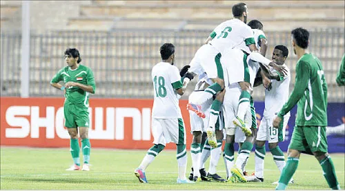 لاعبو المنتخب السعودي يحتفلون بأحد أهدافهم في مباراة الذهاب أمام العراق في عمان
