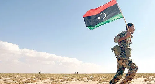 جندي ليبي يحمل علم بلاده أثناء تأديته امتحانا عمليا لتخرجه في منطقة قمينس قرب بنغازي (رويترز)