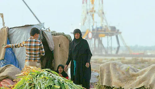 قروية تقف قرب مسكنها في البصرة حيث يبدو برج النفط في حقل (غرب القرنة 2) قريبا منها (رويترز)