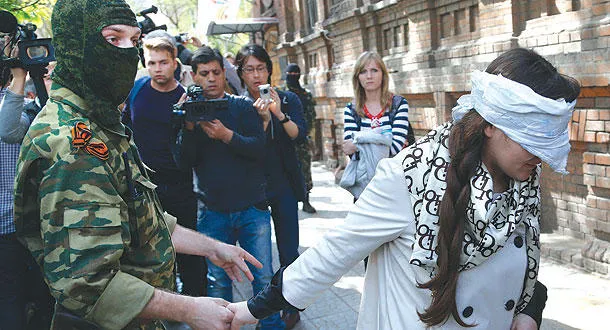 الصحافية والناشطة إيرما كرات معصوبة العينين عقب احتجازها على أيدي عدد من المتشددين يرتدون الملابس العسكرية في مدينة سلافيانسك الأوكرانية أمس (أ.ب)