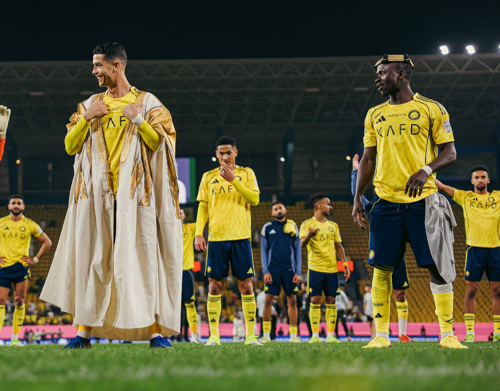 القائد النصراوي مرتديا البشت وإلى جانبه ماني الذي ارتدى العقال المقصب (موقع النادي)