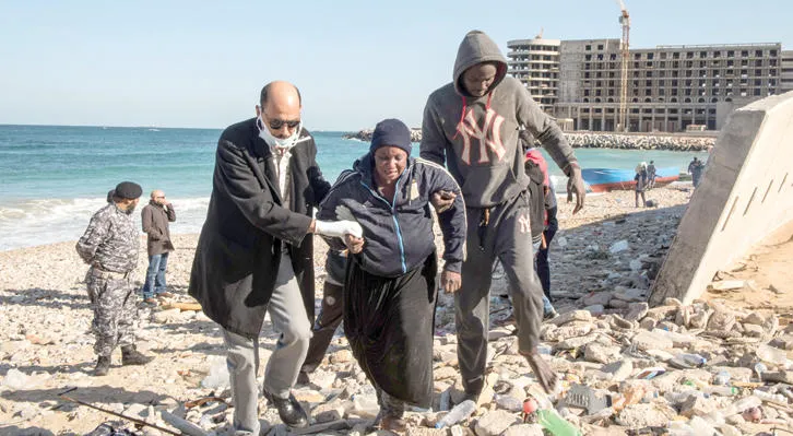 ليبي يساعد مهاجرة غير شرعية بعد أن انقلب القارب الذي كان يقلها بالقرب من الشواطئ الليبية (رويترز)