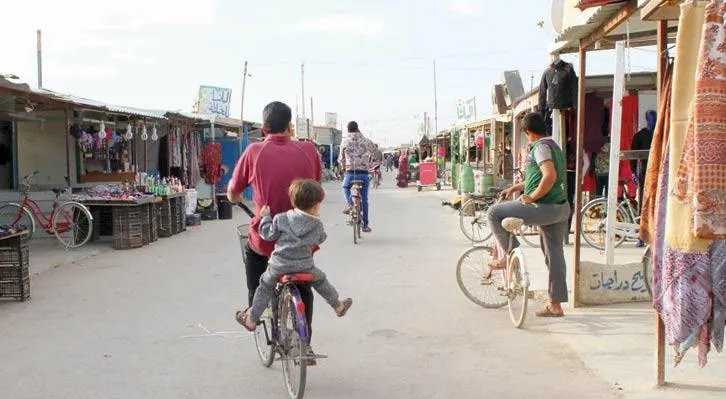 لاجئون سوريون يسيرون بالقرب من أحد أسواق مخيم الزعتري بالأردن الذي يؤوي حوالي 80 الف لاجئى (رويترز)