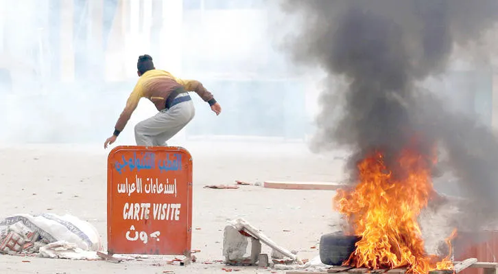 تونسي يشعل النيران أمس أحتجاجاً على قرار السلطات الليبية بغلق الحدود (أ.ف.ب)