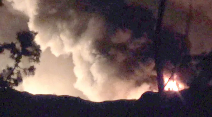 أعمدة الدخان وألسنة النيران تتصاعد من مطار المزة العسكري قرب دمشق بعد قصفه فجر أمس (رويترز)