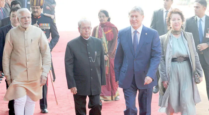 الرئيس الهندي برناب موخارجي (الثاني من اليسار) مع نظيره ألمازبيك أتامباييف رئيس جمهورية قيرغيزستان (الثاني من اليمين) ورئيس وزراء الهند ناريندرا مودي (يسار) وزوجة رئيس قيرغيزستان رئيسة إتمباييفا في نيودلهي الشهر الماضي (إ.ب.أ)
