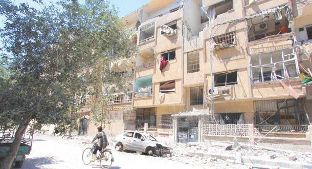 سوري يمر بدراجته الهوائية في أحد شوارع بلدة المليحة بريف دمشق، أمس، بينما تظهر واجهات الأبنية مدمرة جراء المعارك بين النظام والمعارضة (رويترز)