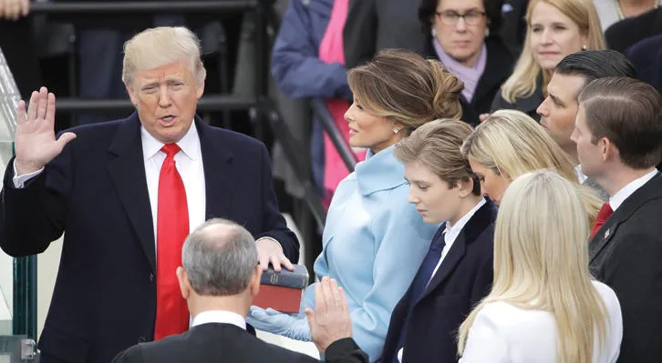 دونالد ترامب الرئيس الـ 45 للولايات المتحدة يؤدي القسم أمام كبير القضاة جون روبرتس خلال حفل التنصيب الذي أقيم في واشنطن أمس وبدت السيدة الأولى الجديدة ميلانيا وآخرون من أفراد عائلة الرئيس (أ.ب)