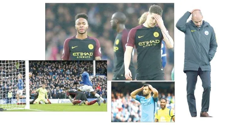 الضغوط تزداد على غوارديولا يومًا بعد يوم (إ.ب.أ) - ستونز وستيرلنغ بعد الهزيمة المذلة أمام إيفرتون («الشرق الأوسط») - أغويرو لم يستوعب خطط غوارديولا بعد («الشرق الأوسط) - الناشىء توم ديفيز (يسار) يزيد من أوجاع سيتي بهدفه الثالث أمام إيفرتون (رويترز)
