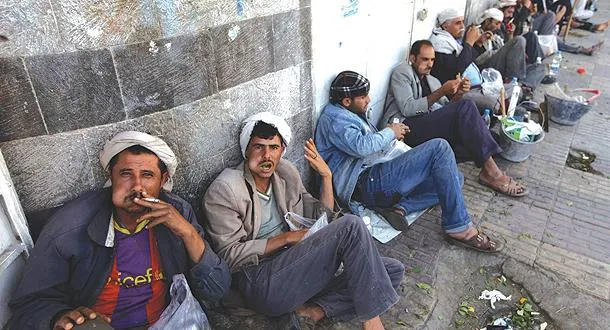 يمنيون يصطفون في انتظار فرص عمل في أحد شوارع صنعاء أمس (رويترز)