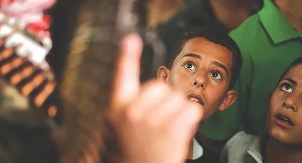 صبيان فلسطينيان يعاينان عنصرا في حماس خلال تشييع قيادي في الحركة قضى في غارة إسرائيلية بخان يونس جنوب غزة أمس (رويترز)
