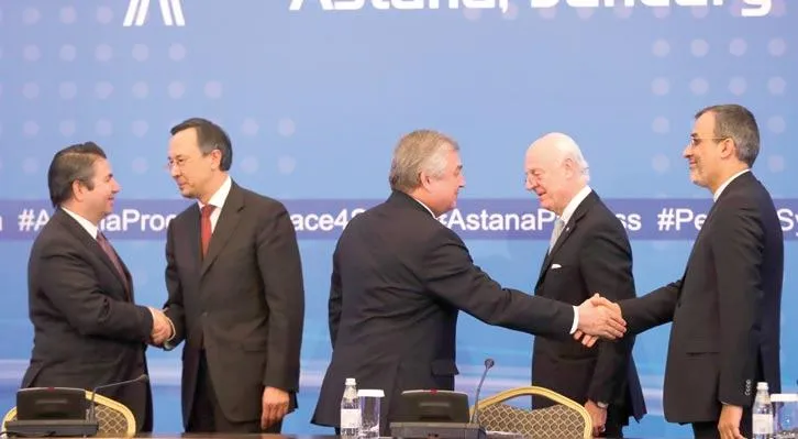 ممثلو روسيا وتركيا وإيران وكازاخستان والمبعوث الدولي إلى سوريا ستيفان دي ميستورا بعد تلاوة البيان الختامي لمؤتمر آستانة أمس (أ.ب)