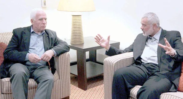 رئيس حكومة حماس المقالة اسماعيل هنية ومسؤول حركة فتح لمباحثات المصالحة عزام الأحمد في غزة أمس (أ.ف.ب)