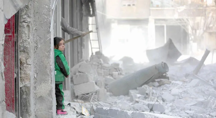 طفلة سورية تطل على الدمار الذي سببته غارات النظام على منزل عائلتها في عربين بالغوطة الشرقية (أ.ف.ب)
