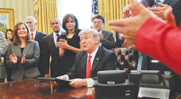 ترمب بعد توقيعه على قرار يدعو لتقليص اللوائح التنظيمية لدى المؤسسات الصغيرة في المكتب البيضاوي أمس (أ.ب)