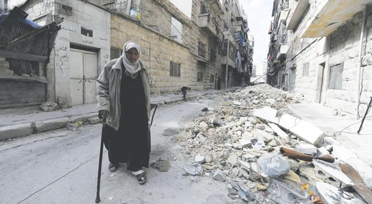 سوري بين الخراب في زقاق بمدينة حلب أمس (رويترز)