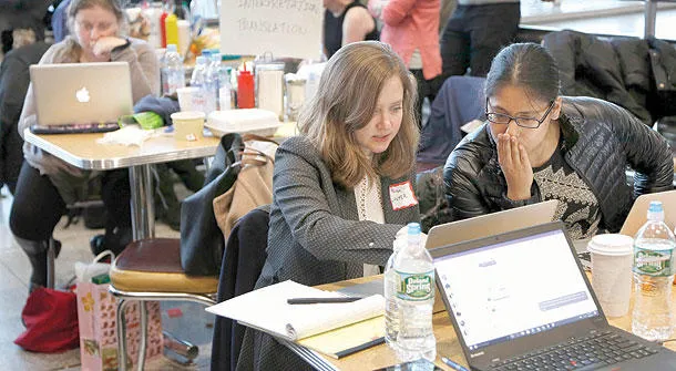 محاميات متطوعات يساعدن مسافرين جرى توقيفهم في مطار جون كيندي بنيويورك تنفيذًا لقرار ترمب حول الهجرة (أ.ب)