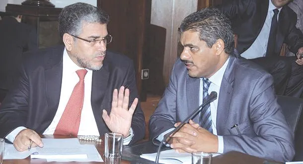 مصطفى الرميد وزير العدل والحريات (يسار) يتحدث إلى النائب محمد حنين رئيس لجنة العدل والتشريع خلال اجتماع اللجنة في مجلس النواب أمس (تصوير: مصطفى حبيس)