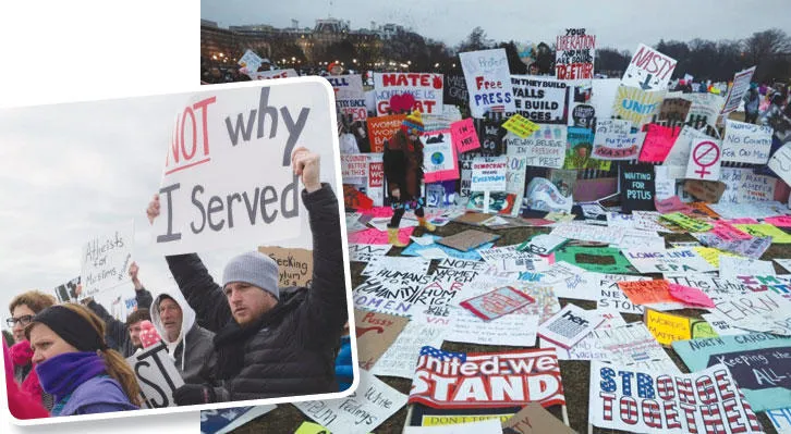 ونشرت صحيفة «واشنطن بوست» ملحقًا عن صور المظاهرات، جاء فيه: «حاربت في أفغانستان والعراق، وها أنا أحارب هنا»، و«ترمب ليس الديكتاتور الذي ما كنت سأقبل به». ولافتة يحملها طفل صغير: «أفضل أن أكون نائمًا، لكنى جئت إلى هنا»، ولافتة لصبية: «مكان المرأة الطبيعي هو التظاهر» (إشارة إلى مثل يقول: مكان المرأة الطبيعي هو المطبخ».