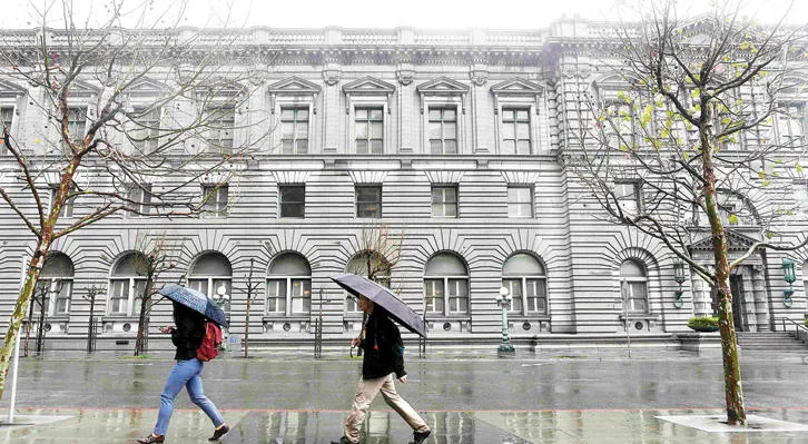 شخصان يمران أمام مبنى المحكمة الفيدرالية في سان فرانسيسكو التي بدأت أمس النظر في استئناف الحكومة ضد قرار تعليق حظر السفر (رويترز)