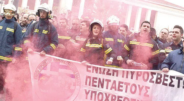 جانب من مظاهرة لعاملي الإطفاء في أثينا أمس اعتراضا على ظروف التشغيل الصعبة (أ.ف.ب)