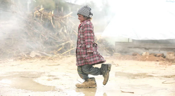 طفلة سورية نازحة في مخيم شرق الغوطة الشرقية بريف دمشق الثلاثاء الماضي وسط موجة برد شديدة تضرب المنطقة (أ.ف.ب)