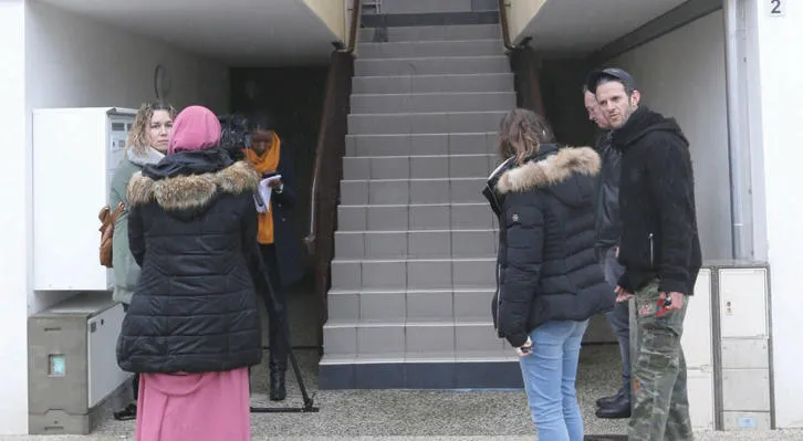 مواطنون فرنسيون يقفون في مدخل المبنى الذي تعرض لعملية دهم قامت بها الأجهزة الأمنية في ضواحي مدينتي مونبليه وسيت أدت إلى إحباط عملية إرهابية كان يخطط لها (أ.ب)