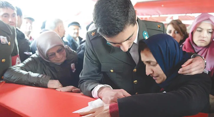 أم ملازم تركي قتل في عملية درع الفرات في سوريا وشقيقه الذي يرتدي بزة أخيه العسكرية يودعان جثمانه خلال مراسم تشييعه في منطقة غوريل بتركيا أمس (غيتي)