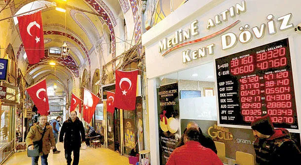 السوق الكبير في اسطنبول ويبدو إلى جانبه لوحة تظهر أسعار العملات مقابل الليرة التركية (رويترز)