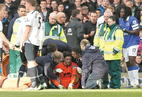 لوريس حارس توتنهام على الأرض محاطا بالجهاز الطبي وهو فاقد الوعي (رويترز)