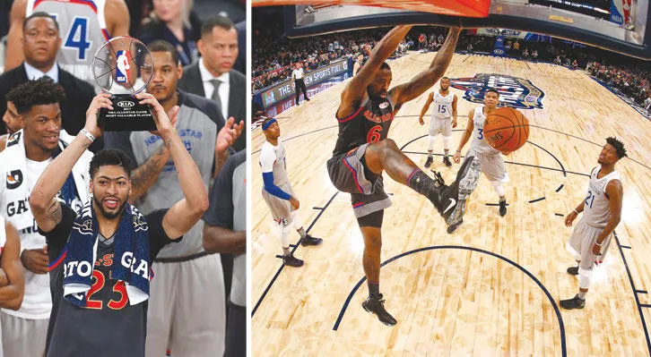 أندريه غوردان لاعب المنطقة الغربية يسجل في سلة الشرقية (أ.ب) - ديفيس يرفع الكأس بعد الانتصار في مباراة «كل النجوم» (أ.ب)