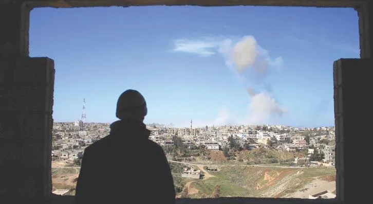 رجل من درعا جنوب سوريا، يرقب الدخان المتصاعد من معارك في المدينة وما حولها، بين قوات النظام وفصائل معارضة للسيطرة على المنطقة (أ.ف.ب)