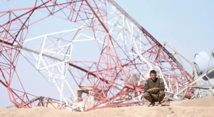 مقاتل من قوات سوريا الديمقراطية التي دخلت، أمس، شمال دير الزور للمرة الأولى ويبدو في الصورة برج اتصالات مدمر على أثر المعارك (رويترز)