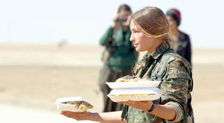 مقاتلة كردية من «قوات سوريا الديمقراطية» توزع وجبات طعام في قرية «صباح الخير» قرب مدينة دير الزور شرق سوريا بعد تقدمها ضد «داعش» بالمنطقة (أ.ف.ب)