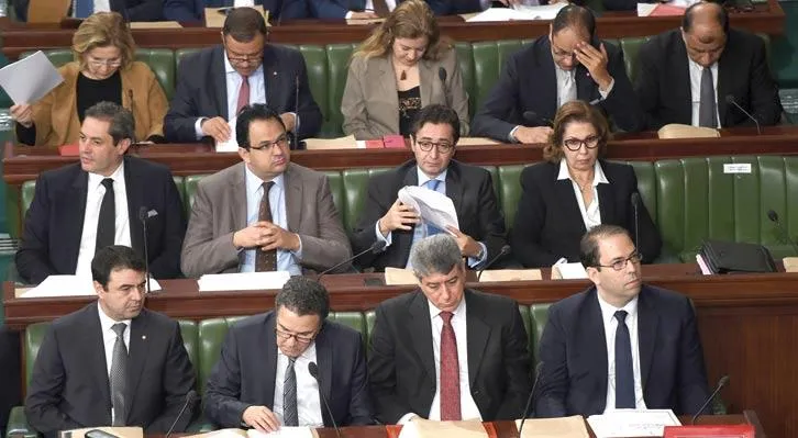 رئيس الحكومة يوسف الشاهد (أقصى اليمين) مع أعضاء حكومته في جلسة برلمانية (غيتي)