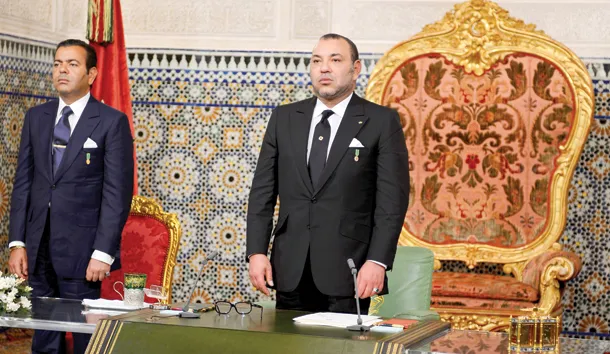 الملك محمد السادس قبل إلقائه خطابه الليلة قبل الماضية.. وبدا إلى جانبه شقيقه الأمير مولاي رشيد (ماب)
