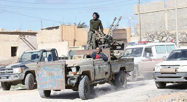 جنود ليبيون يحتفلون بعد استعادة منطقة قنفودة في مدينة بنغازي من أيدي «داعش» (رويترز)