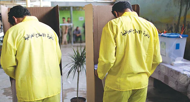 سجينان يدليان بصوتيهما في سجن الرصافة ببغداد أمس (رويترز)