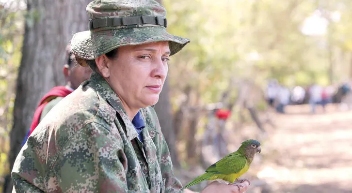 مقاتلة من حركة فارك تحمل طائرا أثناء استقبالها لجنود الجيش الكولومبي لإنهاء صراع مسلح دام أكثر من 50 عاما (إ.ب.أ)