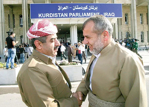 نائبان كرديان بعد اختتام الجلسة الافتتاحية للبرلمان الكردستاني المنتخب في أربيل أمس (أ.ف.ب)