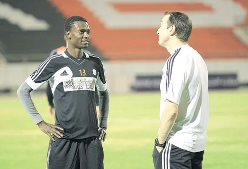 حسن معاذ يتحدث مع أحد مساعدي المدرب خلال تدريبات الشباب الأخيرة