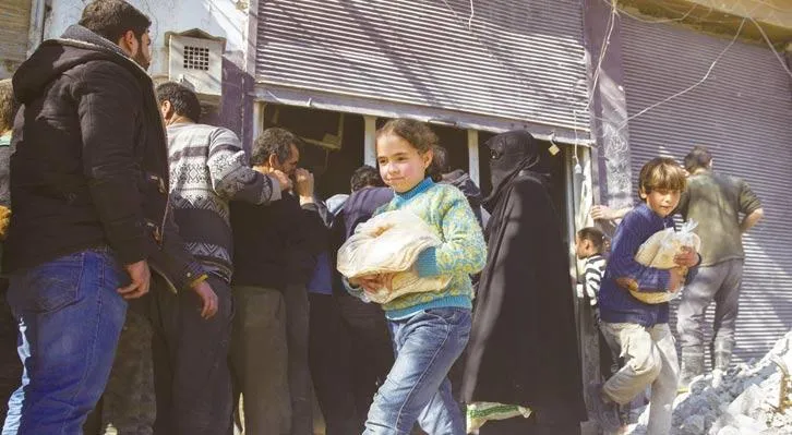 طابور أمام مخبز في مدينة الباب بالشمال السوري أمس (غيتي)