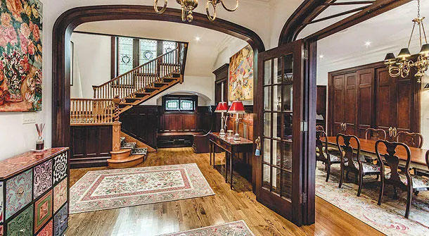 يوجد في هذا المنزل، المعروض للبيع مقابل 2.6 مليون دولار، والذي تبلغ مساحته 5 آلاف قدم مربع، 6 غرف نوم، و4 حمامات كبيرة، وحمامان صغيران، إلى جانب كثير من العناصر، التي تميز الحقبة التي تم بناء المنزل خلالها، ومن بينها الأسقف العالية، والأحجار المنقوشة، والنوافذ الضخمة. وقام المالك الحالي بترميم المنزل بشكل كبير منذ نحو 20 عاماً على حد قول مونتانارو.