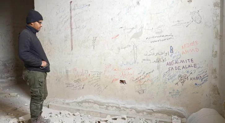 خليفة الخضر معتقل سابق لدى «داعش» في مدينة الباب يقف قرب جدار داخل سجن كان ورفاقه يكتبون عليه ملاحظاتهم (أ.ف.ب)