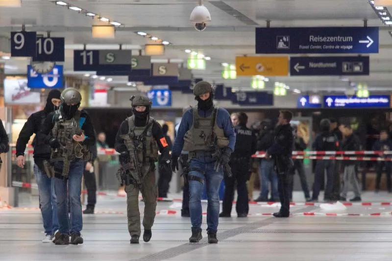 وصول القوات الخاصة للشرطة الألمانية إلى محطة القطارات الرئيسية في دوسلدورف غرب ألمانيا بعد هجوم بفأس (أ.ف.ب)