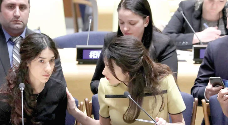 أمل كلوني تتحدث إلى نادية مراد الناجية الإيزيدية من «داعش» خلال اجتماع في الأمم المتحدة أول من أمس (إ.ب.أ)