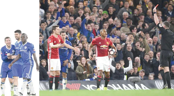 تفوق أنطونيو كونتي على جوزيه مورينيو للمرة الثانية هذا الموسم إذ فاز تشيلسي 1 - صفر على مانشستر يونايتد في ستامفورد بريدج الاثنين، ليتأهل للدور قبل النهائي لكأس الاتحاد الإنجليزي لكرة القدم. وكان هدف نغولو كانتي في الدقيقة 51 كافيا لفريق كونتي، الساعي للفوز بثنائية من الألقاب هذا الموسم، لتخطي مقاومة يونايتد بعدما عانى الفريق الضيف نقصا عدديا إثر طرد أندير هيريرا في الدقيقة 35 بعد حصوله على بطاقتين صفراوين لارتكابه مخالفتين بحق إيدن هازار. «الغارديان» تستعرض هنا أهم خمس نقاط جديرة بالدراسة من هذه المواجهة.