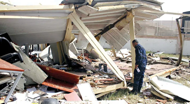 عنصر أمن ليبي يعاين الدمار الذي تعرض له أحد مقرات حكومة الغويل بعد أن سيطرت عليها قوات فائز السراج أمس (رويترز)