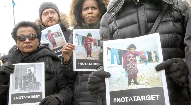 موظفو الأمم المتحدة في وقفة صمت أمام المبنى الرئيسي للمنظمة الدولية أمس في الذكرى السادسة للنزاع في سوريا رافعين صوراً تعبر عن احتجاجهم على معاناة المدنيين والأطفال تحديداً (أ.ب)
